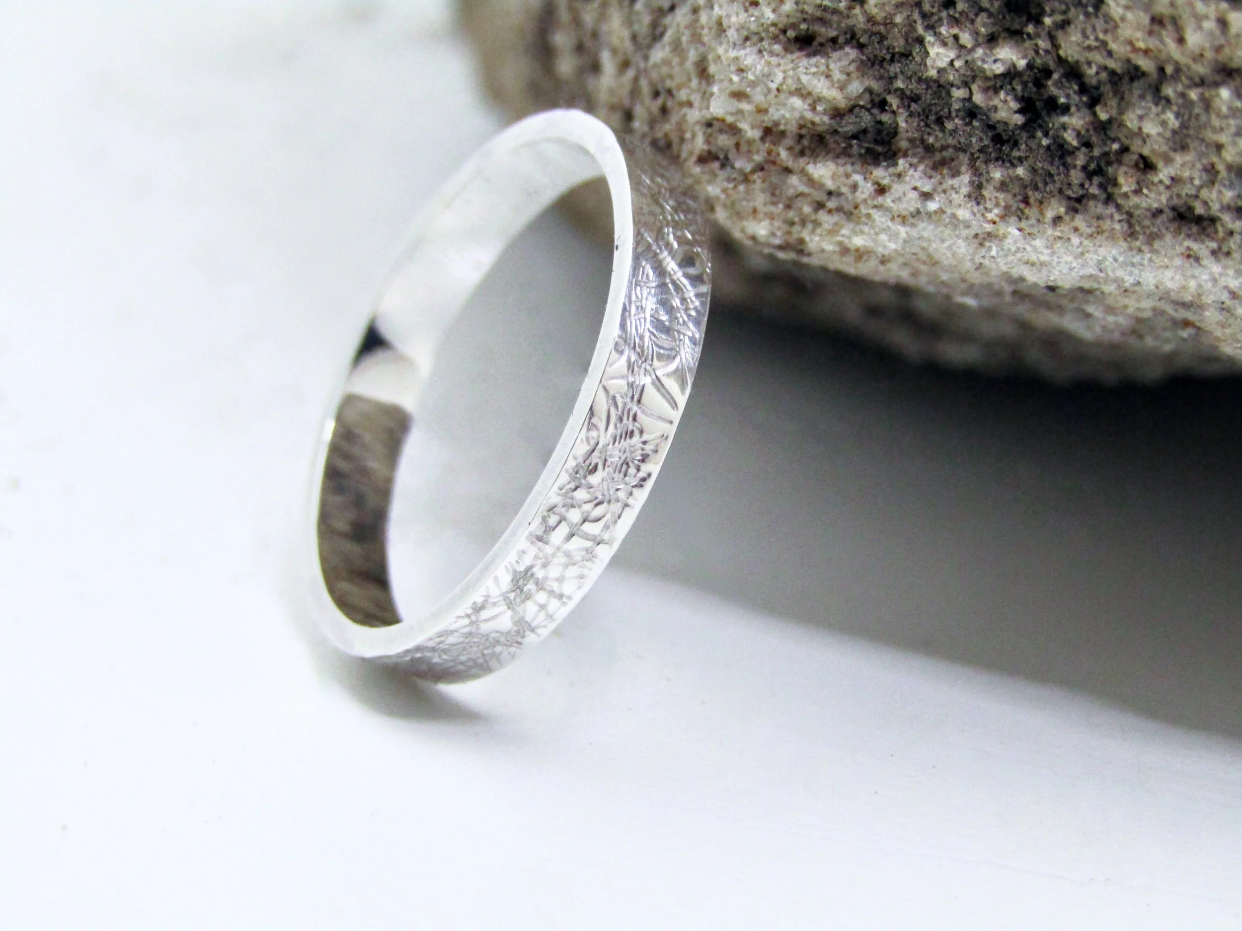 The attractive texture on this ring is an impression of a tangled and woven mesh, which interestingly contrasts with the clean lines and simplicity of the overall form.